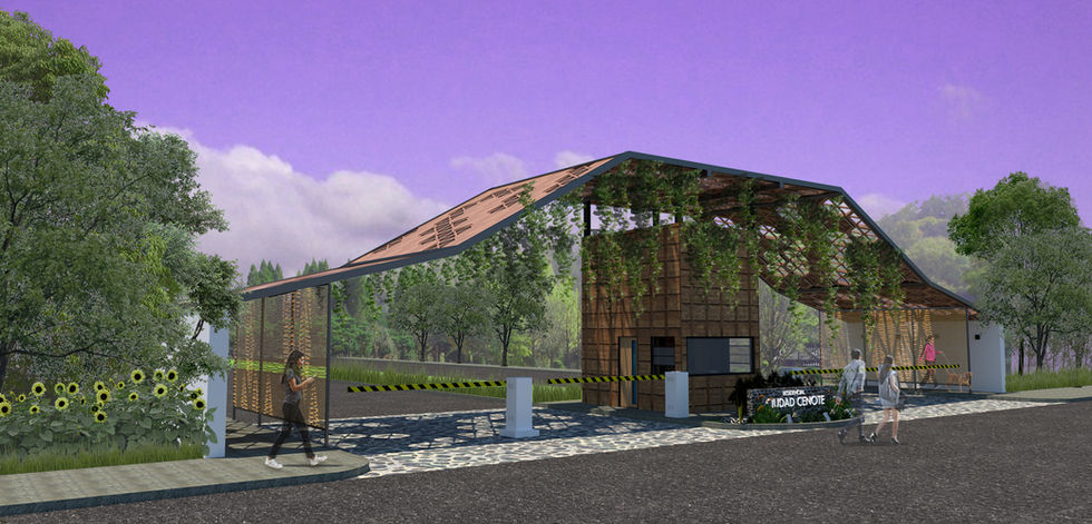 El Proyecto es resultado de un concurso realizado en el Estado de Quintana Roo, por el grupo The Artist 2020 el cual consistía en diseñar acceso para un fraccionamiento exclusivo. Se ubica en un lote a las afueras de la ciudad capital, rodeado de zonas arboladas. Se comenzó desde el bosquejo a partir de formas que asemejan el sitio tomando en cuenta el diseño de elementos y materiales de la zona. Asentando el proyecto con una visión más realista, en el sentido económico, social y arquitectónico, con base a la reglamentación para vehículos y respeto al peatón. La forma de trabajo fue en conjunto, realizando el proceso de dibujo, volumetría y renderizado para la entrega de dicho proyecto. El concepto parte de un techado con forma ascendente, haciendo referencia a las pirámides existentes en el estado. La cubierta tiene módulos en forma de hexágonos interconectados. La materialidad comprende de madera del sitio, estructuras de PTR para auto portarse, y al final cargar en los extremos en muros solidos de piedra repellada y pintada de color blanco. El acceso es controlado, con 4 carriles para entrada y salida de coches, y en los extremos se propone una banqueta amplia para acceso peatonal.